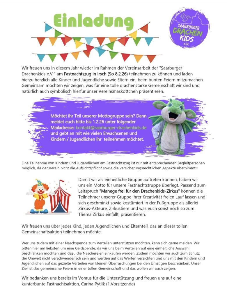 Wir freuen uns in diesem Jahr erstmalig im Rahmen der Vereinsarbeit der “Saarburger Drachenkids e.V ” am Fastnachtszug in Irsch (So 23.2.2025) sowie in Saarburg (Sa 1.3.2025) teilnehmen zu können und laden hierzu herzlich alle Kinder und Jugendliche sowie Eltern ein, beim bunten Feiern mitzumachen. Gemeinsam möchten wir zeigen, was für eine tolle drachenstarke Gemeinschaft wir sind und natürlich auch symbolisch hierfür unser gerade entdecktes Vereinsmaskottchen präsentieren. Zur Teilnahme in unserer Mottogruppe meldet euch bitte unter folgender Mailadresse kontakt@saarburger-drachenkids.de an mit Angabe der teilnehmenden Erwachsenen/Kinder bzw Jugendliche und wahlweise “Teilnahme Irsch”, “Teilnahme Saarburg” “Teilnahme beide Umzüge”. Eine Teilnahme von Kindern am Fastnachtszug ist natürlich nur mit entsprechenden Begleitpersonen möglich, da der Verein nicht die Aufsichtspflicht übernehmen kann. Damit wir als einheitliche Gruppe auftreten können, haben wir uns natürlich auch ein entsprechendes Motto für unsere Fastnachtstruppe überlegt. Passend zum Leitspruch “Seid gespannt was euch erwartet; unsere Drachen sind gestartet” können die Teilnehmer unserer Gruppe ihrer Kreativität freien Lauf lassen und sich geschminkt sowie kostümiert in der Fußgruppe als Drache, magische Fabelwesen oder alles was sonst zur fantasievollen Drachenwelt einfällt, präsentieren.