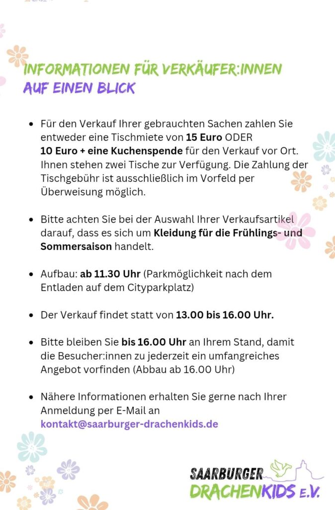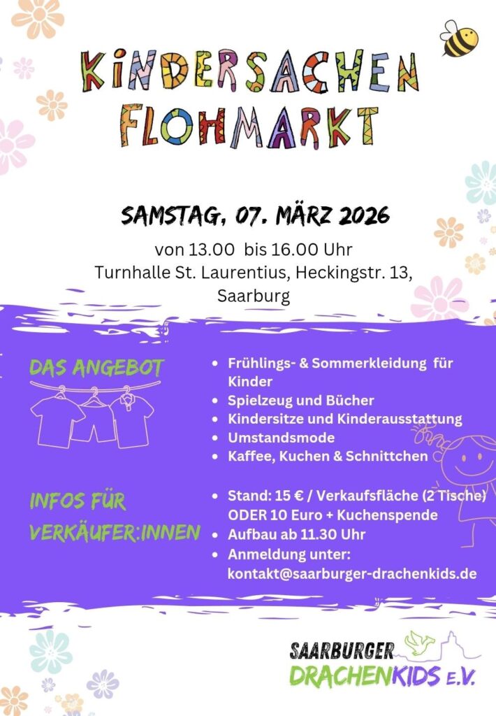 Wir freuen wir uns euch mitzuteilen, dass wir am Samstag, 7.03.2026 unseren nächsten Kindersachen-Flohmarkt organisieren. Von 13-16Uhr in der Turnhalle der Grundschule St. Laurentius (Heckingstr. 13, Saarburg) können somit Frühlings- und Sommerkleidung für Kinder, Spielzeug und Bücher, Kindersitze und andere Kinderausstattung, Umstandsmode und vieles mehr rund ums Kind zum Verkauf angeboten werden. Gegen eine Gebühr von 15 Euro oder alternativ 10 Euro inklusive verbindliche Kuchenspende können die Verkäufer Tische mieten und ihre Waren selbst anbieten und verkaufen. Der Aufbau für die Verkäufer ist ab 11.30 Uhr möglich. Tischreservierungen und nähere Informationen sind ab sofort per Email unter folgender Adresse möglich. kontakt@saarburger-drachenkids.de