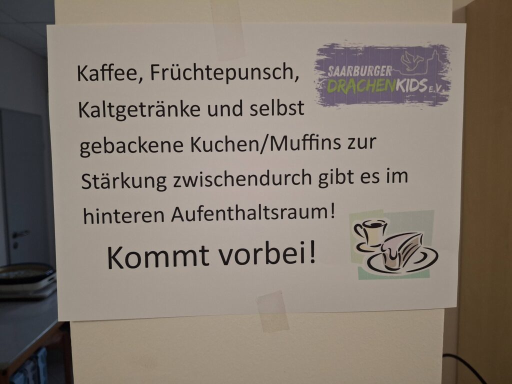 Wir von den Saarburger Drachenkids durften die Veranstaltung im Bereich der Verpflegung begleiten und im Nebenraum Kaffee, Kaltgetränke und selbstgebackenen Kuchen anbieten.