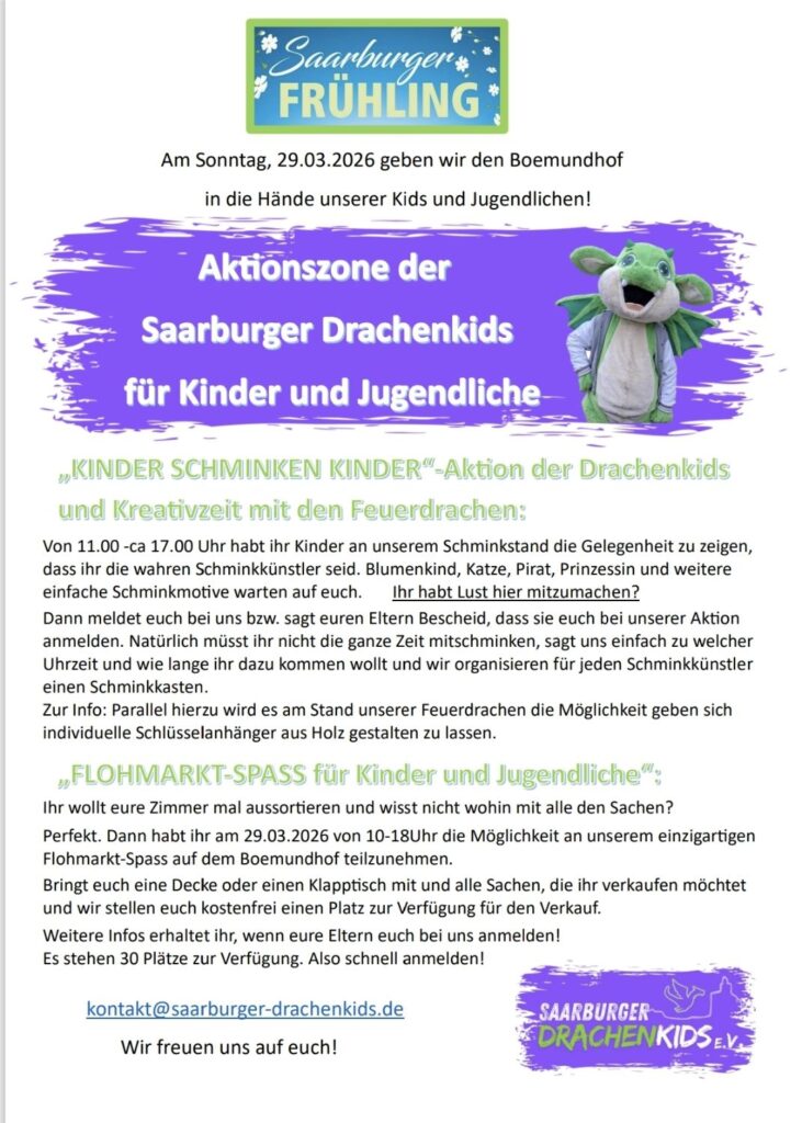 Anlässlich des Saarburger Frühling des SGV übernehmen wir von den Saarburger Drachenkids die Gestaltung der Aktionszone auf dem Boemundhof inklusive des Flohmarkts für Kinder und Jugendlichen, der tollen “Kinder-schminken-Kinder”-Aktion, einer Kreativaktion der Feuerdrachen und unserem Waffelstand!