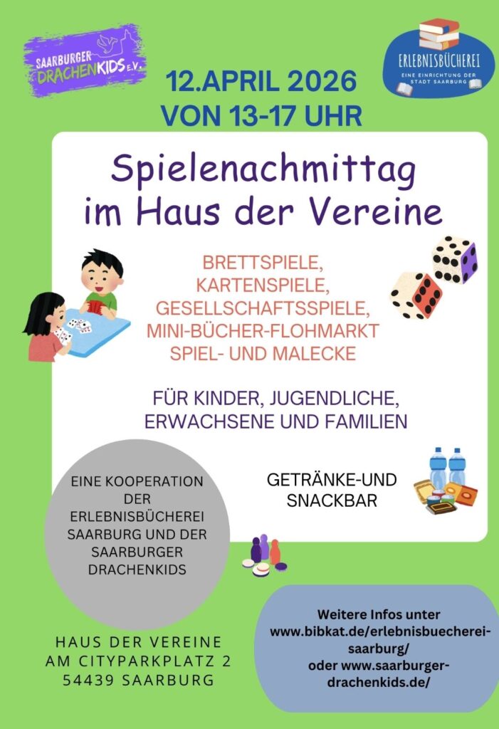 Am 12. April verwandelt sich das Haus der Vereine in Saarburg von 13 bis 17 Uhr in einen Treffpunkt für alle, die Spaß an Spielen haben. Gemeinsam mit der Erlebnisbücherei Saarburg laden wir, die Saarburger Drachenkids, euch herzlich zu einem abwechslungsreichen Spielenachmittag ein.