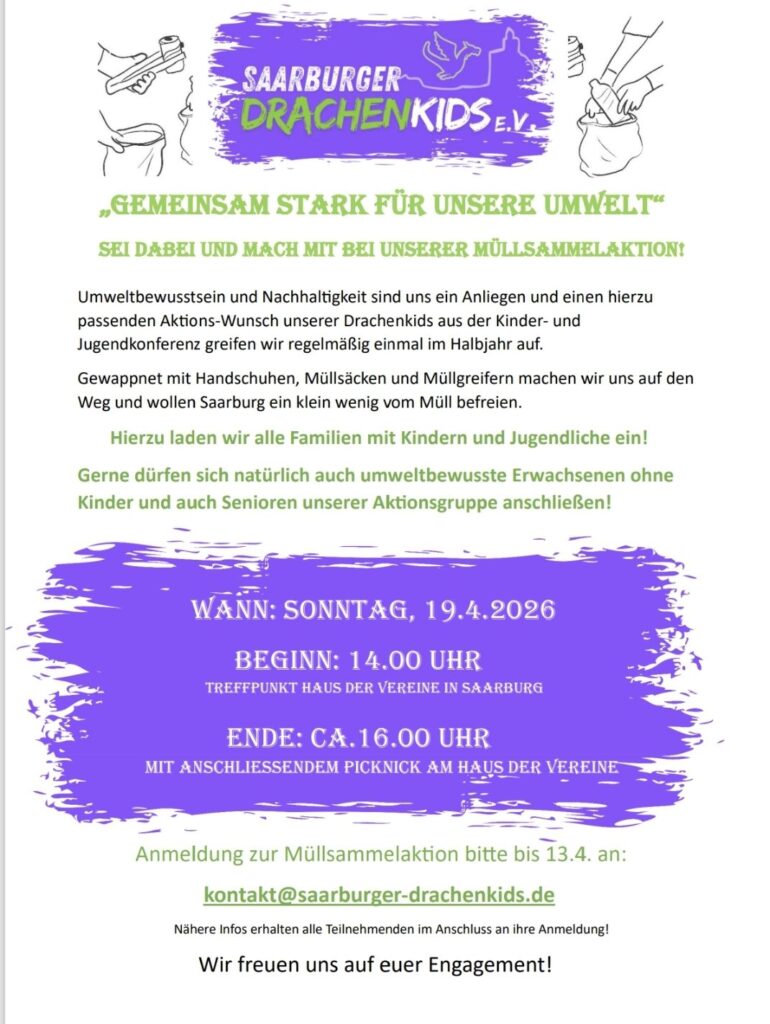 Wenn ihr uns gerne unterstützen möchtet oder nähere Informationen benötigt, meldet euch bitte bis 9.5.2025 bei uns: kontakt@saarburger-drachenkids.de Wir sagen jetzt schon Danke für die Mitarbeit!